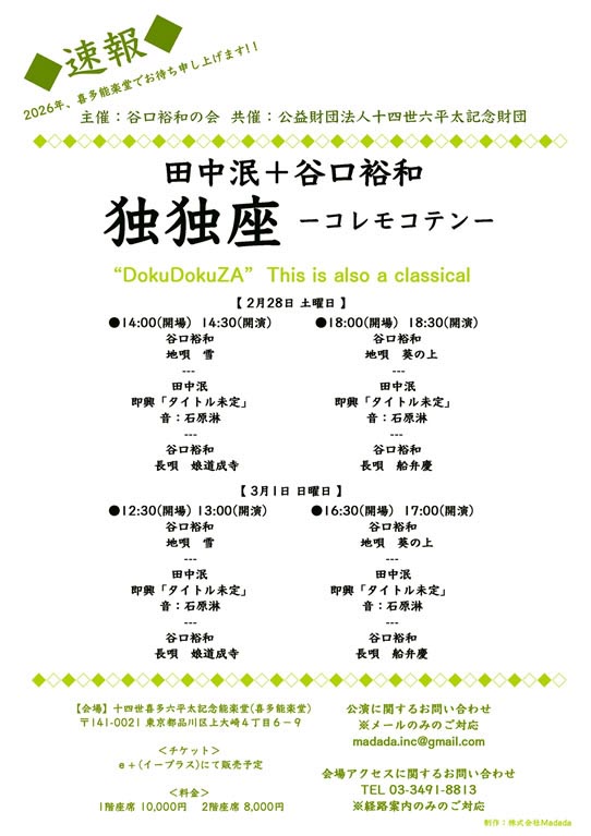 28日:田中泯・谷口裕和独独座 喜多能楽堂14:30〜&18:30〜